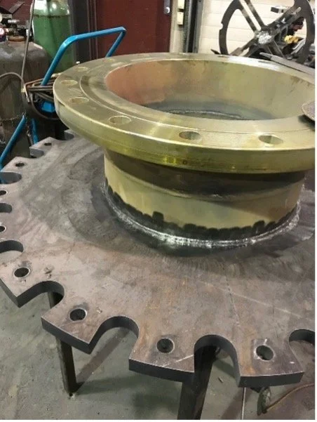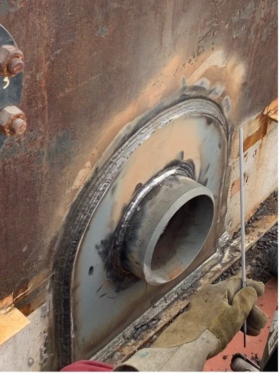 The tank wall, Manway or D-Door is prepared down to base metal, inspected using Magnetic Particle (MT) and Ultrasonic Thickness (UT) Testing to ensure the material contains no existing defects. If Material Test Records cannot be provided for the specific location on the tank, manway or d-door the locations will be tested using LIBS Analyzers or Spark Test Spectrometry to determining the Carbon Equivalency Value. The location is then tested using an EWI Heat Sink Test to determine the cooling rate is within weld procedure parameters, and amperage checks are completed on the weld machine with a max amperage being set. A weld build up is applied to the parent material of the tank or manway to temper the material and avoid the use of traditional PWHT methods which can create excessive heat inside the tank wall. The weld build up pad (buttering pad) is then inspected again with MT and UT, and the nozzle weld root and fill is completed with a full H4 low hydrogen welding rod to avoid any additional hardness in the weld. The nozzle is then inspected using Ultrasonic shearwave and Magnetic Particle testing and the tempering (buttering) is completed for the repad installation. These welds require a specified delayed cooling period (24-48 Hours) to allow for any hydrogen induced cracking or other defects to occur.